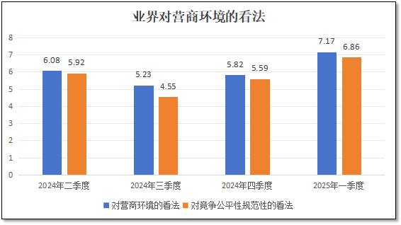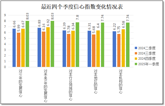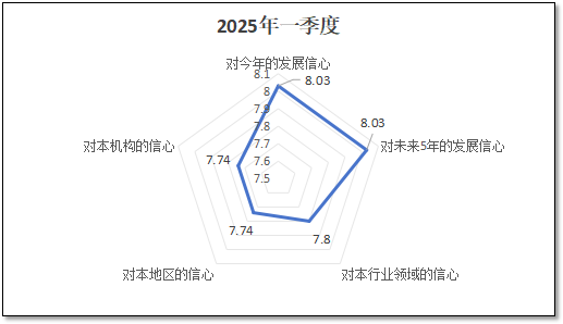 从“未来5年的信心指数”这一中期信心指标来看,在2024年二季度末该指标的得分分值为6.83分,三季度末下降到6.16分,在四季度回升到6.92分后,2025年一季度进一步提高到8.03分,比上一季度高出1.11分,也是四个季度以来的最高值。这说明进入2025年以后,尤其是我国一季度经济指标出炉之后,国际社会认识到中国经济发展的潜力和后劲,加之同期美国将关税战的大棒向全世界挥舞,一定程度上促进了欧洲等地向中国靠拢,大家进一步认识到加强贸易交流往来、维护国际公平贸易秩序的重要性,进而对中国经济发展向好的预期进一步增强。在这些因素叠加影响之下,检验检测从业者们对行业的中期发展信心也有了较大增长。