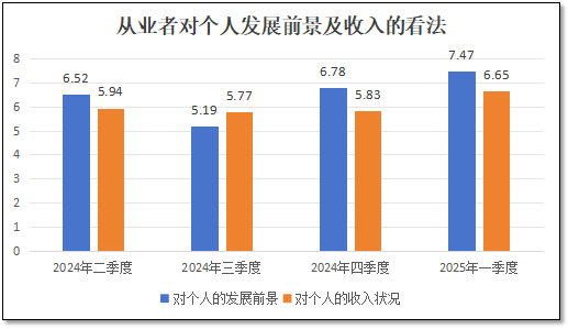 此外,在本次统计调查中,检验检测从业者们对“本人在业内的发展前景信心”这一指标打出的分值为7.47分,也是四个季度以来的最高分,但比同期从业者们对检验检测行业整体的发展信心值8.03分要低,这说明从业者们尽管认为行业会向好发展,但由于近年来极度内卷的国内就业市场,对自身发展的乐观情绪还有限。而对于个人的收入状况满意度的这一指标的看法,2025年1季度末得分为6.65分,也是四个季度以来的最高分,说明随着对行业发展预期的提升,从业者们认为自身的收入状况也会水涨船高。