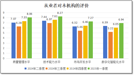 由上图可见,在四季度,从业者们对本机构的“质量管理水平”打分为8.06分,对“技术能力水平”打分为8.27分,对“市场开发水平”打分7.27分,对“数字化智能化水平”打分为6.94分。从这些数据来看,从业者们打出的分值均为四季度以来最高的,且对本机构的技术能力最有信心,对质量管理水平的信心次之,对市场开发水平和数字化智能化水平的打分相对较低。
