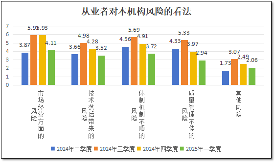关于本机构面临风险的总体看法,调查问卷从“市场经营”、“技术能力”、“体制机制”、“质量管理”以及“其他”等五个方面进行了测评,并与前四个季度的结果进行了比较,相关数据如下图所示。