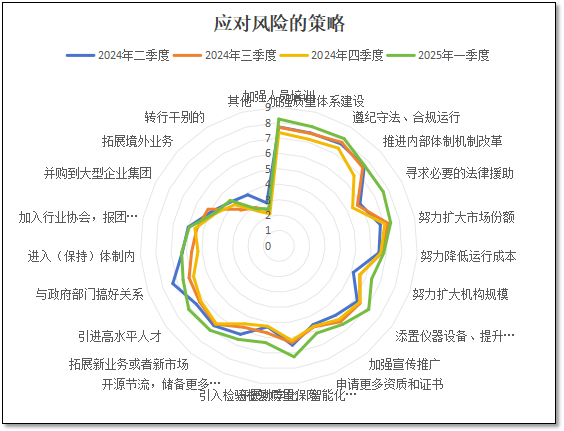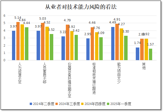 由上图可见,对于技术能力方面的风险来说,到了2025年1季度末,各分项指标的分值都较上一季度出现了下降。不过对于“人力资源不足”、“仪器设备设施不足”以及“标准和技术难以跟进”等三个指标的分值仍比2024年二季度要高,说明随着市场预期的好转,尤其是2025年以来业务数量的迅速增长,很多检验检测机构明显感觉人力资源和仪器设备资源不足,更担心于不能按时按量完成业务工作。