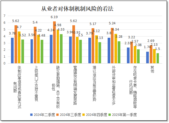 由上两图可见,对于体制机制方面的风险细分项目,2025年一季度风险分值相较上一季度均出现了回落,除了“缺乏激励措施,员工没有积极性”这一分项的分值还比2024年二季度略高之外,其余分项的分值均为四个季度以来的最低值,表明从业者们对体制机制方面的感受也有好转,较为不满意的仍然是管理中缺乏激励措施问题。
