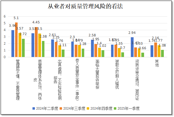 从上图可以看到,到了2025年一季度,从业者们对本机构质量管理方面的风险感受大幅度下降,各分项得分分值均为四个季度以来的最低值。这说明检验检测机构经过多年运行,尤其是在市场监管部门连续多年严格、规范的管理之下,检验检测从业者普遍建立了比较清晰和完整的质量管理观念,在长期的质量体系运行过程中积累了较为丰富的经验,认为这方面的风险程度已经大为降低。