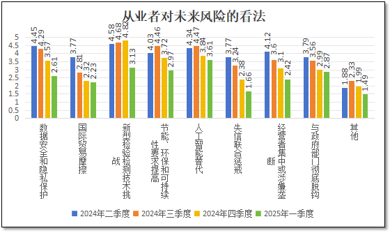 由上图可见,对于未来可能出现的风险分值均出现下降,说明从业者们比前三个季度显得更乐观,对风险的研判更加积极。其中,由于2025年一季度中美关税战大规模爆发,引发大家对国际贸易摩擦的担忧,因此这一分项的分值下降幅度较小,其他各个分项的分值下降幅度均较大。