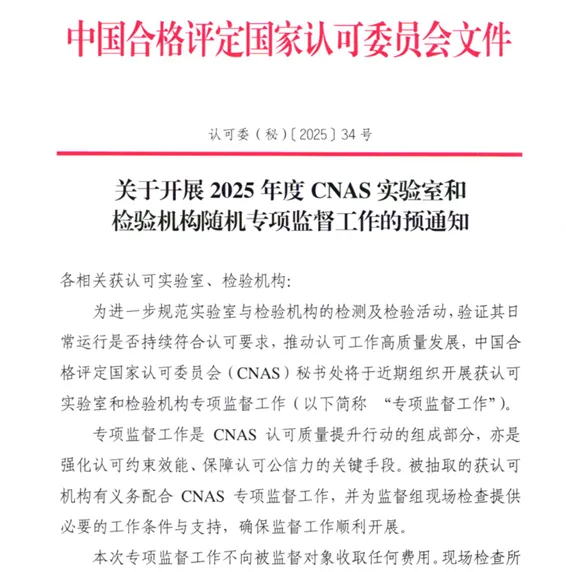 CNAS将开展2025年度获认可实验室和检验机构随机专项监督工作