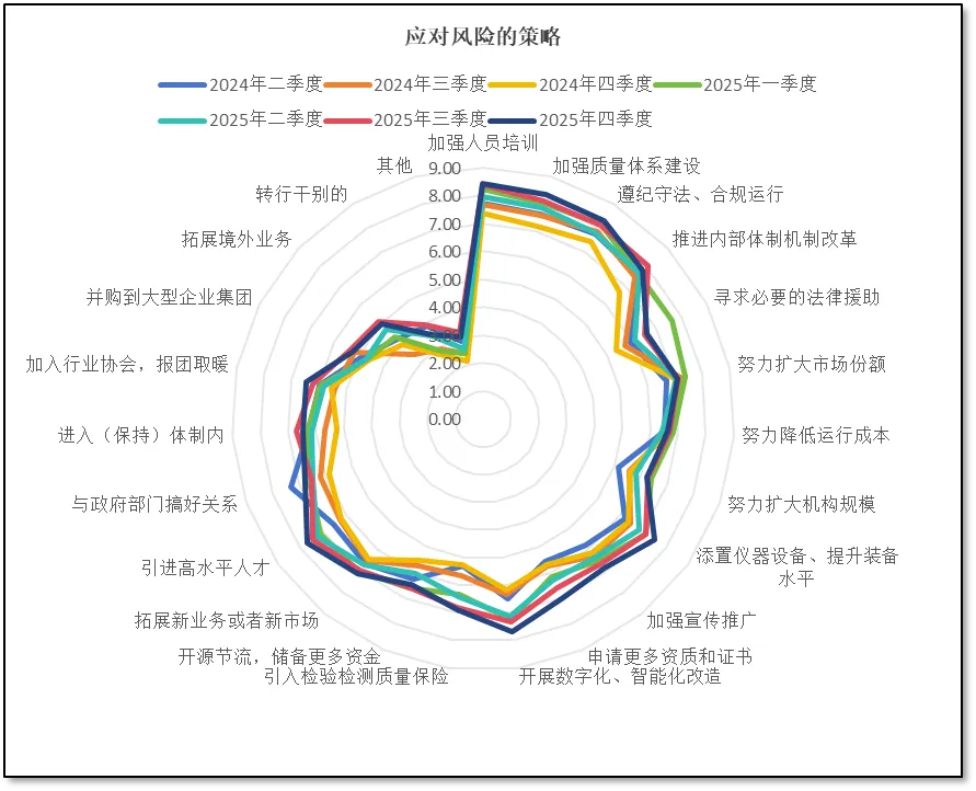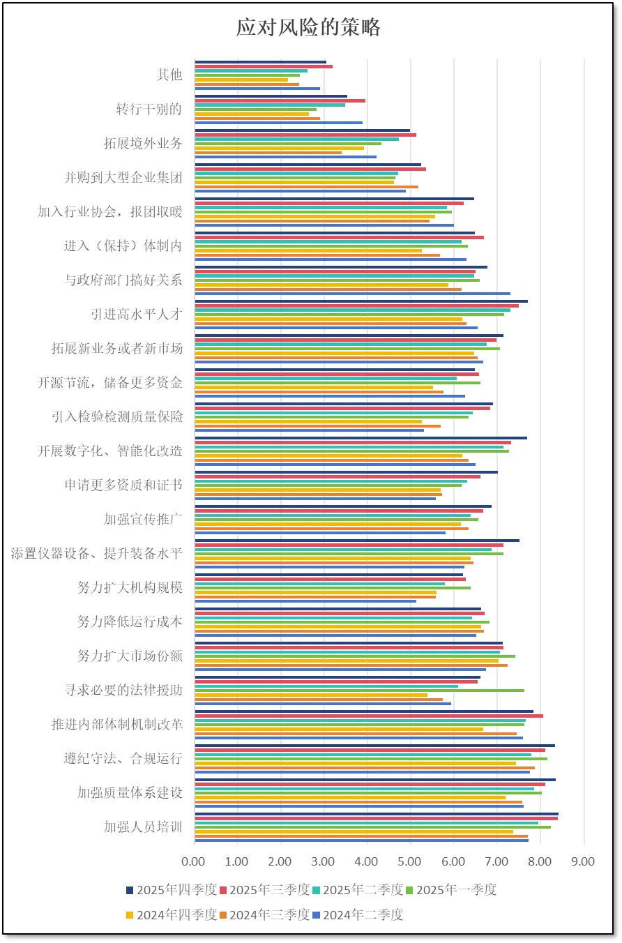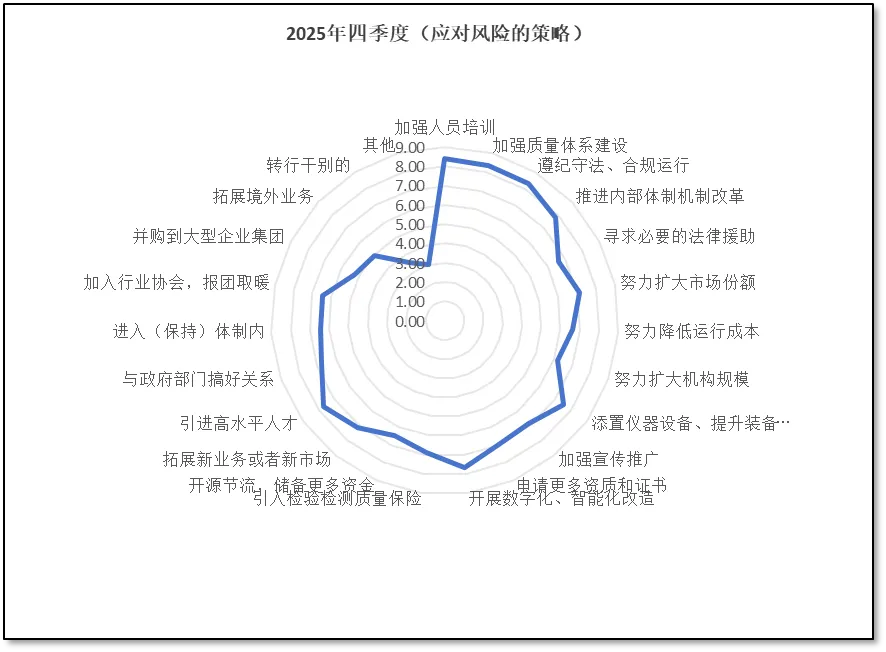 由上面两图可见,四季度以来,从业者们认为本机构所面临的各方面风险均有一定程度增加,其中,认为“市场经营”方面的风险增长最为明显,分值为4.87分,较3季度增长了0.88分,这也是2025年以来的最高值。这与前面从业者们对本机构发展信心有所下降形成呼应,说明尽管行业整体向好,但由于市场环境日趋复杂,对检验检测机构管理层正确决策的要求越来越高,稍有不慎可能就会导致机构运行出现问题,因此从业者们的信心才会动摇和下降,认为市场经营方面的风险有所增大。