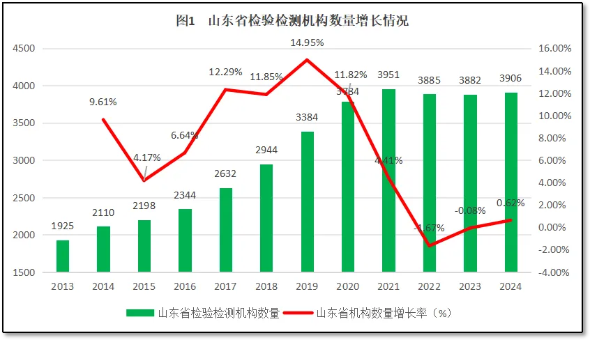 由图1可见,过去12年,山东省检验检测机构数量变化主要分为两个阶段,在2021年之前连续9年持续增长;但从2021年起,检验检测机构数量基本保持在3900家左右。2024年末,山东省的检验检测机构数是3906家,是2013年末的2.03倍,年均增速为6.78%。从年度增长率曲线来看,2015年至2019年,山东省检验检测机构数量增长曲线存在一次比较明显的增长高峰,增长率逐年增大,并在2019年达到14.95%的高点。不过在此之后,山东省检验检测机构数量增速开始下降,2022年度和2023年度均为负增长,2024年虽有小幅反弹,但增长也很细微。山东省检验检测机构曾在2017年之前多年排名全国第一,2017年被广东省超越,降到第二位;2023年,江苏省检验检测机构数量超越山东,山东的排名掉落到第三名。