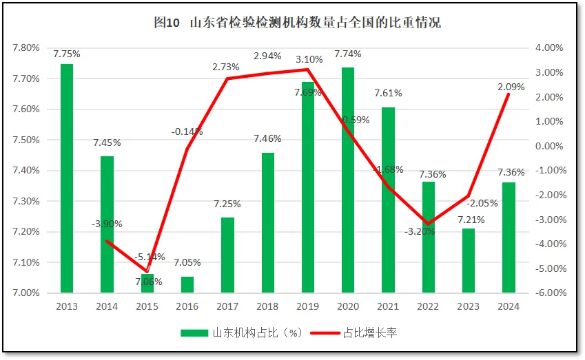 截至2024年末,山东省检验检测机构数量为3906家,约占全国检验检测机构数量的7.36%,排名保持在全国第3。过去12年,山东省检验检测机构数量在全国检验检测行业中的占比以及占比的增长率如图10所示。