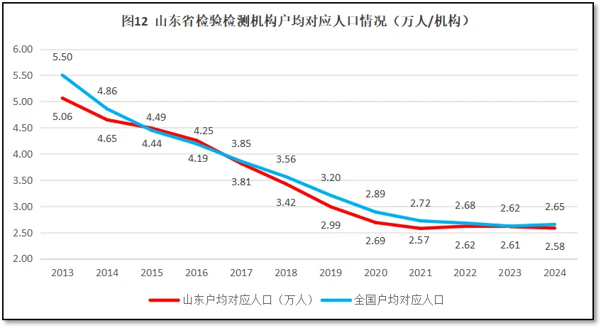 以下为山东地区检验检测机构户均对应服务的人口数据。2024年末,山东省常住人口1.008亿人,检验检测机构户均服务人口2.58万人,略低于全国平均数2.65万人的水平。过去12年,山东省检验检测机构户均对应的人口数量与全国的情况进行比较,如图12所示。