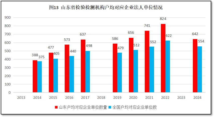 由图13可见,山东省检验检测机构户均对应的企业法人单位数量均高于全国平均数,说明山东地区制造业发达、企业数量众多,对检验检测行业来说比较友好。但2024年度数据显示山东省这方面的优势下降,需要关注。