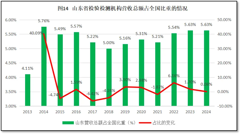 山东作为检验检测大省,其检验检测机构营收总额在全国检验检测行业中排名第6。2024年度,山东省检验检测机构营收总额达到274.68亿元,占全国检验检测行业年度营业收入的5.63%。过去12年山东省检验检测行业年度营业收入总额在全行业中的占比情况如图14所示。
