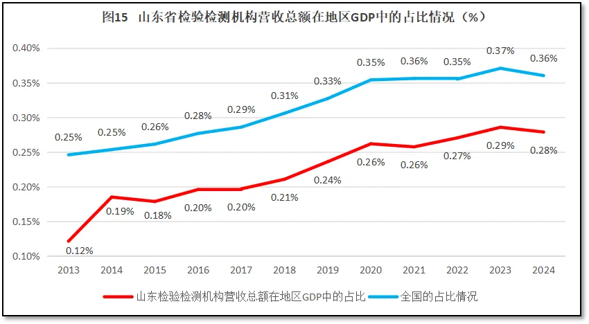 再来看山东省检验检测机构营收总额在其地区生产总值GDP中的占比情况。2024年度,山东省检验检测机构营收总额274.68亿元,占当年山东省GDP值的0.28%,远低于全国平均值0.36%,排名全国第19(由高到低排序),处于全国后列。过去12年山东省检验检测机构营收总额在当地GDP值的比例变化情况如图15所示。