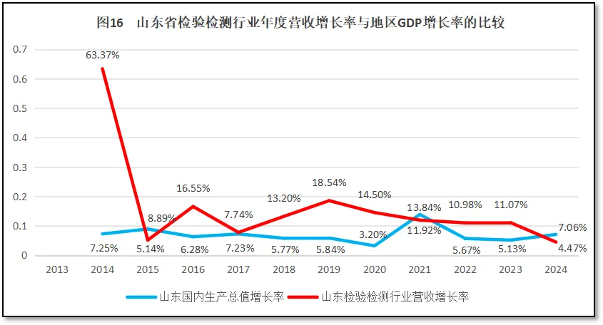 由图16可见,总体来说,山东省检验检测机构年度营收总额的增长率一直高于当地GDP的同比增长率(在2015、2021等个别年份除外),且增长率在2015年以后就十分稳定,年均增速保持在12.2%左右,约为山东省GDP增速的两倍。不过,2024年营收增长率出现了明显下降,低于山东省GDP的同比增长率,说明2024年山东省检验检测行业面临较大困难,营收增长没有跑赢当地经济增速。
