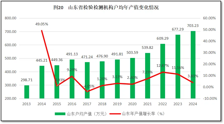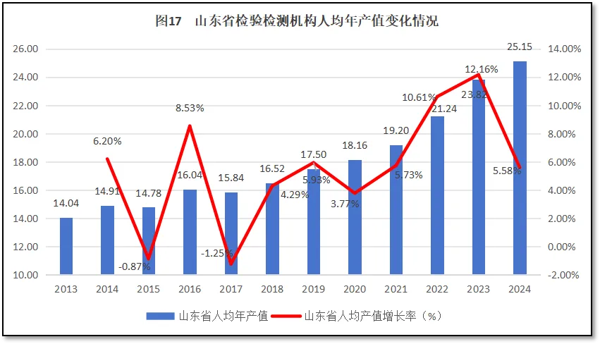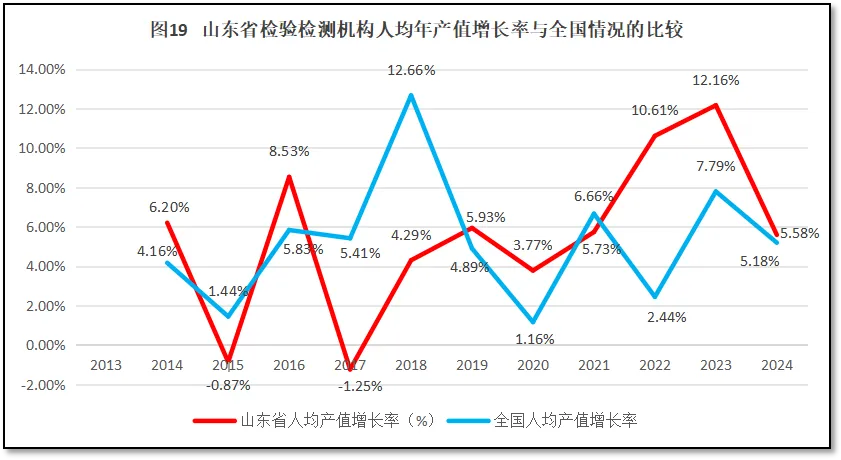 由图19可见,山东省与全国检验检测机构人均年产值增长率的变化规律有不小差异。在2018年之前,山东省检验检测机构人均年产值的增长率波动十分剧烈,隔年大起大落。在2018-2023年总体保持持续上升的趋势,2024年又出现比较显著的下滑。这说明,2024年山东省检验检测行业受宏观经济下行等客观因素影响较为严重,叠加行业内本来就存在的机构过多、低价竞争、激励措施少等问题,进一步压缩了检验检测机构的发展空间。