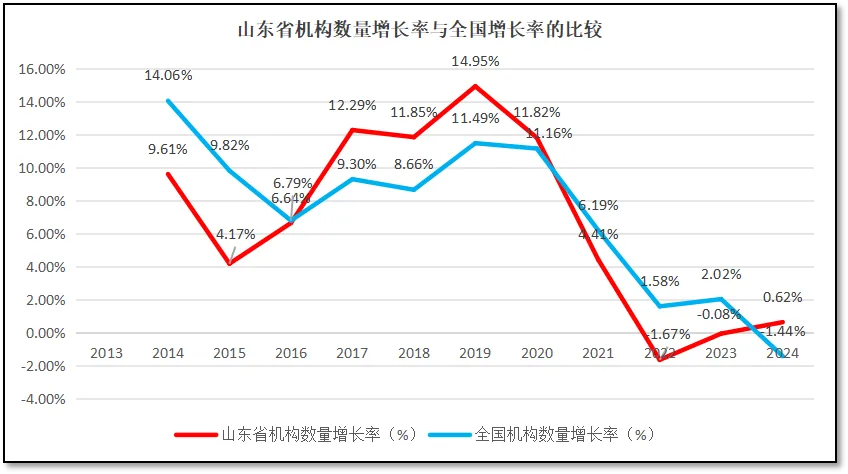 由图2可见,山东省检验检测机构数量的增长率变化趋势与全国的情况比较相似。在2016年之前,全国检验检测机构数量增速放慢的时候,山东省检验检测机构数量也同步放慢,但到了2016年,全国检验检测机构数量增速降到谷底的时候,山东检验检测机构数量开始止跌回升,提前1年进入增长区间。在2017-2019年全国检验检测机构数量保持高位增长的时候,山东省检验检测机构数量也保持高位增长,且增幅更大。不过,到2020年全国检验检测机构数量增速开始下降后,山东省检验检测机构数量下降的坡度更大,甚至出现了负增长(检验检测机构净减少)。过去12年山东省检验检测机构数量的平均增速为6.78%,比全国7.23%的年均增速略低。2024年,山东省检验检测机构数量出现轻微反弹,但全国检验检测机构数量仍持续下降,显示出山东省检验检测行业发展特点与全国普遍情况的细微差异。
