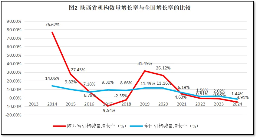 山东省检验检测机构数量增长率与全国检验检测机构数量的增长率进行比较,如图2所示。