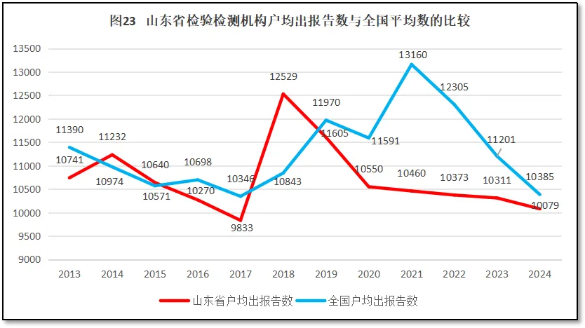 2024年度,山东省检验检测机构户均出具检验检测报告10079份,略低于全国平均水平10385份,全国排名第7,处于中等偏上水平。从2013年以来,山东省检验检测机构户均出具检验检测报告数量与全国的比较如图23所示。