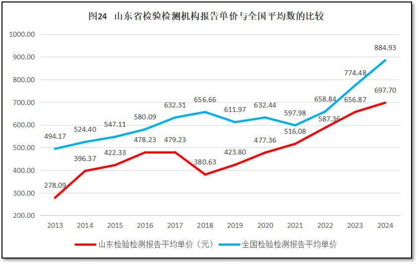 再来看山东省检验检测报告单价的情况,过去12年山东省检验检测报告单价与全国情况的比较如图24所示。