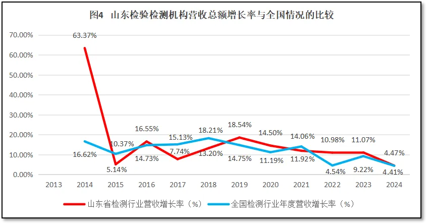比较山东省检验检测行业年度营收总额增长率与全国检验检测行业年度营收总额增长率,如图4所示。