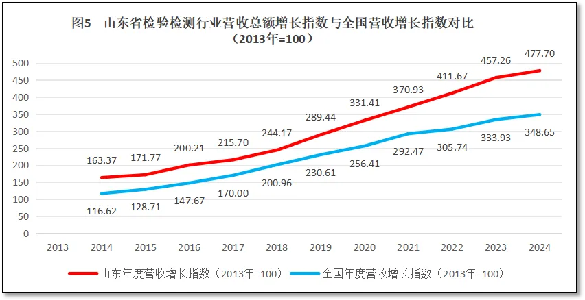 由上图可见,山东省检验检测机构营收总额增长指数一直保持着高于全国平均数的水平发展,曲线始终高于全国平均线,显示出较强的发展实力。且随着时间的推移,山东省检验检测机构营收增长指数还逐步拉大了与全国平均数的差距,到2024年增长指数相差接近130,说明山东省检验检测行业发展质量较高。