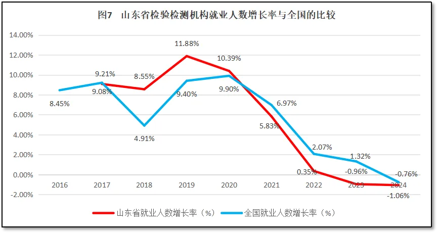 过去9年山东省检验检测行业就业人口的变化情况如图6所示。由图6可见,从2016年到2023年,山东省检验检测机就业人口数量从7万多人增长到10万多人,年均增速5.5%。不过,从2021年开始,山东省检验检测机构的就业人口数量就停止了增长,2023、2024两个年份均出现了人数的“净减少”。从就业人口同比增长率来看,山东省检验检测机构就业人口增长率在2019年度达到最高峰,为11.88%,之后开始下降,2024年度增长率仅为-1.06%,在2023年出现负增长之后,再创历年最低值。