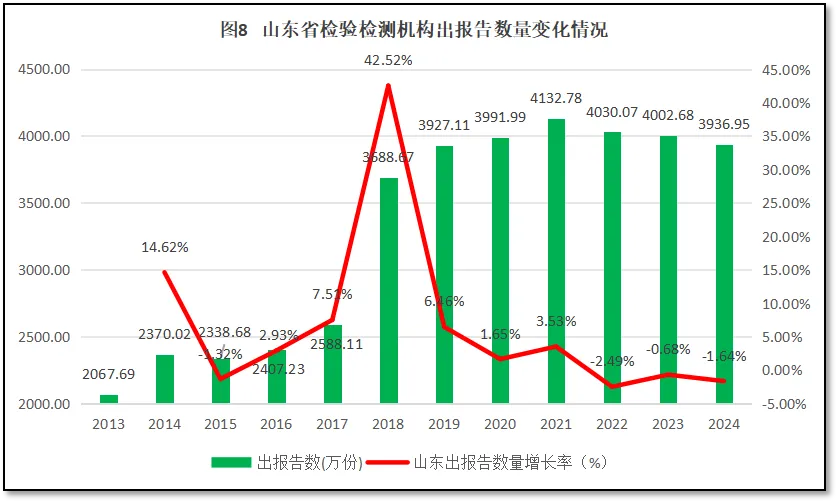 从图8来看,山东省检验检测机构年度对外出具检验检测报告数量在2018年左右有一个十分明显的增长台阶。在2018年之前,山东省检验检测机构出具检验检测报告在2000余万份左右,没有特别大的起伏。但2018年山东省检验检测机构出具的报告数量净增加1000多万份,达到3688万份。在此之后,山东省检验检测机构出具的报告数量又保持稳定,在4000万份左右波动,最近四年呈现缓慢下降的趋势。2024年度山东省检验检测机构出具3936.96万份报告,在全国排名第3位。山东省检验检测机构2024年度出具报告的数量是2013年度报告数量的1.90倍。
