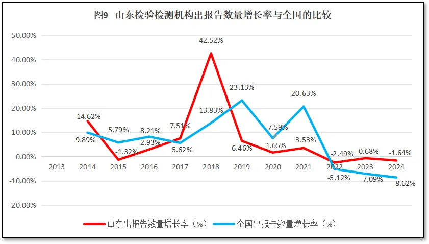 山东省检验检测机构出具报告数量的增长率与全国的比较如图9所示。