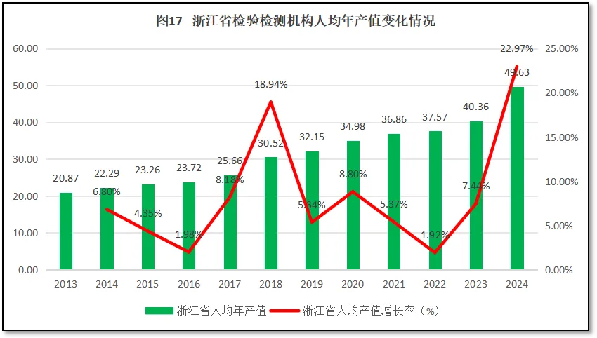 由图可见,2024年度,浙江省检验检测机构人均年产值49.63万元,远高于30万元的行业温饱线,也比2024年度全国31.45万元的平均值高得多,排名居于全国第4位(由高到低排序)。这表明浙江地区检验检测机构总体经营状况良好,人员的劳动生产率高,机构盈利能力很强。过去12年,浙江省检验检测机构人均年产值持续保持增长,2018年突破30万元的“温饱线”,2024年达到49.63万元,是2013年的2.38倍。虽然浙江省检验检测机构人均年产值的起点也不高,但发展很快,尤其是2018年前后出现一个增长高峰,2024年又出现一个增长高峰(也是12年来增幅最大的一次,达到22.97%)过去12年浙江省检验检测机构人均年产值年均增幅达到8.37%。
