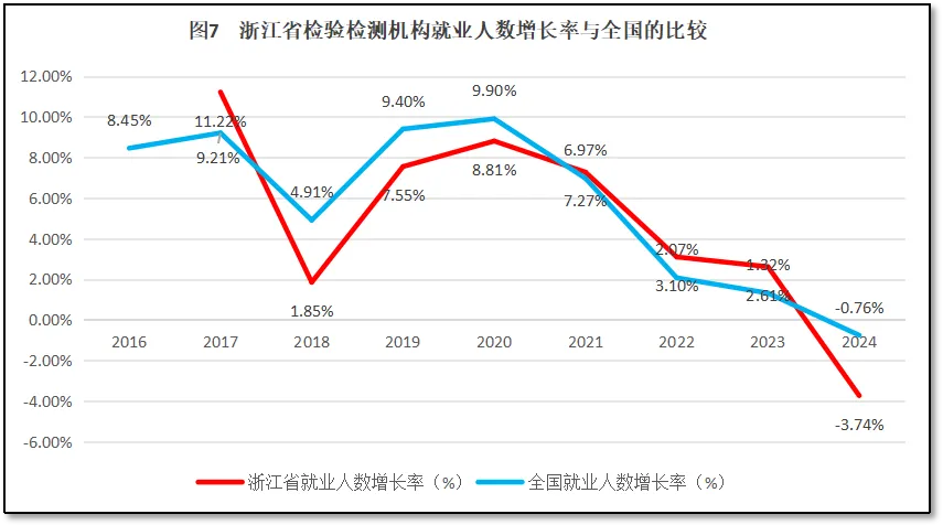 由图7可见,浙江省检验检测机构从业人数增长率与全国检验检测从业人数变化的曲线十分接近,都是在2017-2018年出现下降,在2019年大幅反弹,从2020年起再逐步下降。浙江省在多数年份里就业人数增长率都低于全国平均水平,反弹的幅度比全国平均水平小一些,2024年浙江省下降的幅度较大,显示出比较显著的规模缩小效应。