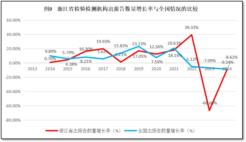 浙江省检验检测机构出具报告数量的增长率与全国的比较如图9所示。