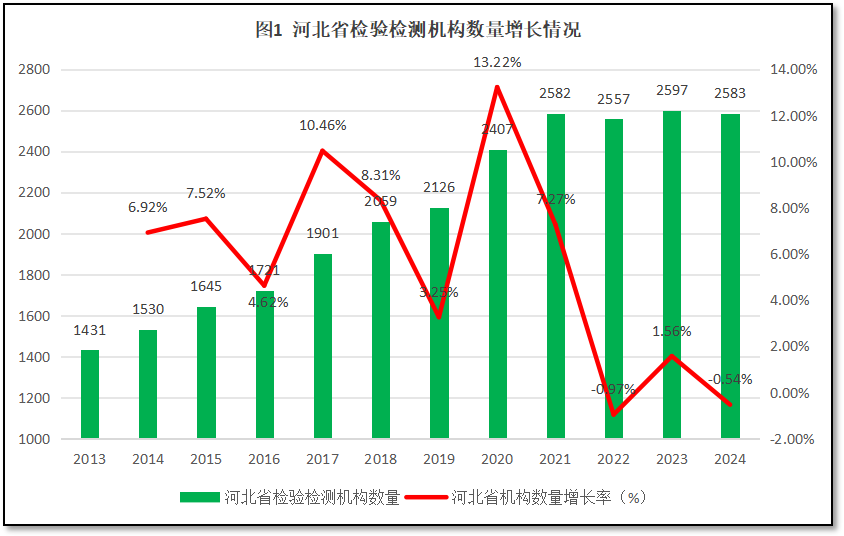 由图1可见,在2021年之前,河北省检验检测机构数量总体保持增长,但2021年之后检验检测机构数量较为稳定,基本保持不变。2024年末,河北省的检验检测机构数是2583家,是2013年末的1.81倍。12年来,河北省检验检测机构数量的年均增速为5.6%。从年度增长率曲线来看,河北省检验检测机构数量的增长率呈现波动变化的特点,每隔一两年就有一次大的涨跌,在2017和2020年先后出现超过10%的增长峰值,但2019和2022年接续出现较大跌幅。2023年增长率有轻微反弹,但2024年又一次出现减少。