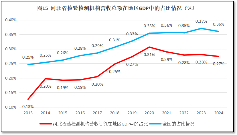从图15可见,12年来,从2016-2020年,河北省检验检测机构营收总额在当地GDP中的占比有所增长,一度达到0.31%的峰值。此后逐步走低,2024年度已经下滑到0.27%左右。河北省检验检测机构营收总额占当地GDP的比值一直比全国平均数要低,且近几年还有被全国平均数拉开差距的迹象。这说明河北省检验检测机构在河北省经济版图中的地位不高,其创造的价值与河北省的经济总量相比还很微小,最近几年这一情况并没有发生根本变化。