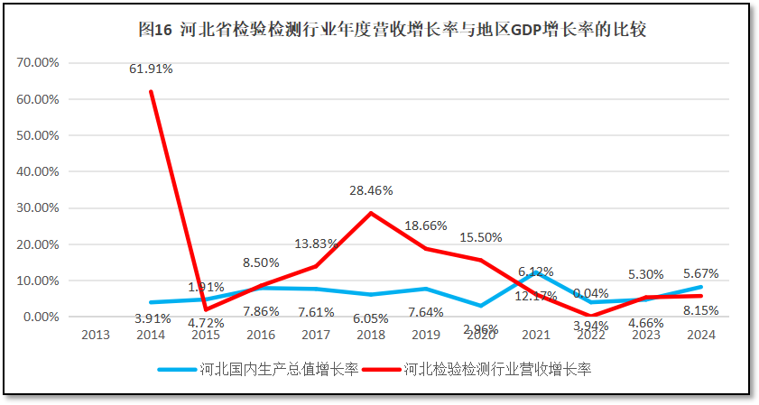 河北省GDP年度增长曲线与河北省检验检测机构年度营收总额增长曲线比较,如图16所示。