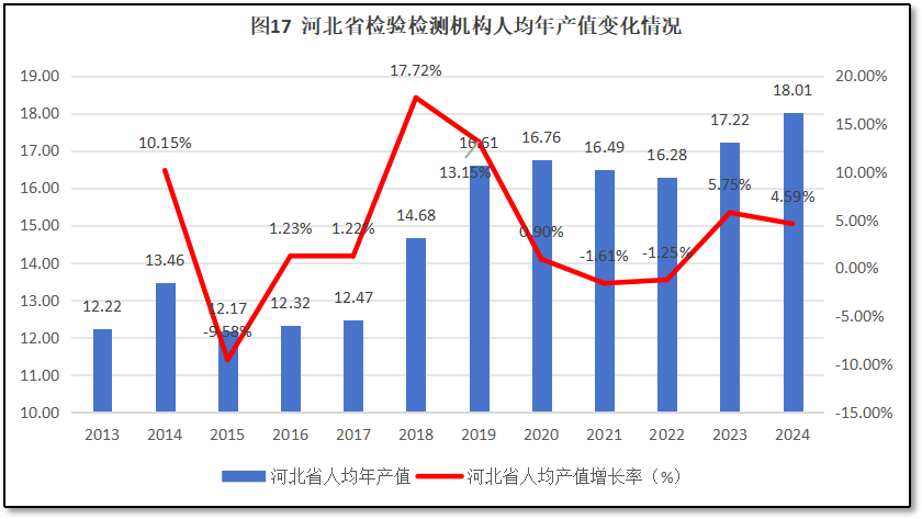 由图17可见,过去12年河北省检验检测机构人均年产值总体保持增长,2024年达到18.01万元,是2013年的1.47倍。但增长过程并非线性,而是出现了几次起伏。从增长率来看,在2015-2018年,河北省检验检测机构人均年产值增长较快,但从2018年以后逐年下降,2021年和2022年连续两年人均年产值出现“净下降”。2023年,河北省检验检测机构人均年产值增幅有所反弹,但2024年度增长率低于2023年度,仅有4.59%,说明增长仍有困难。