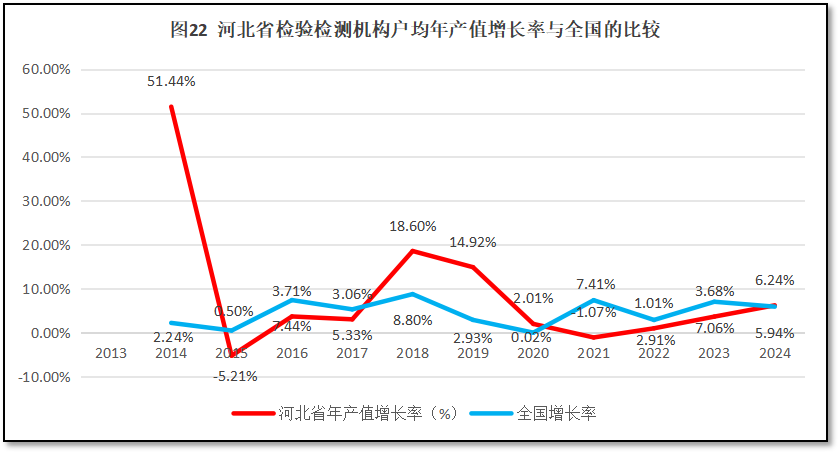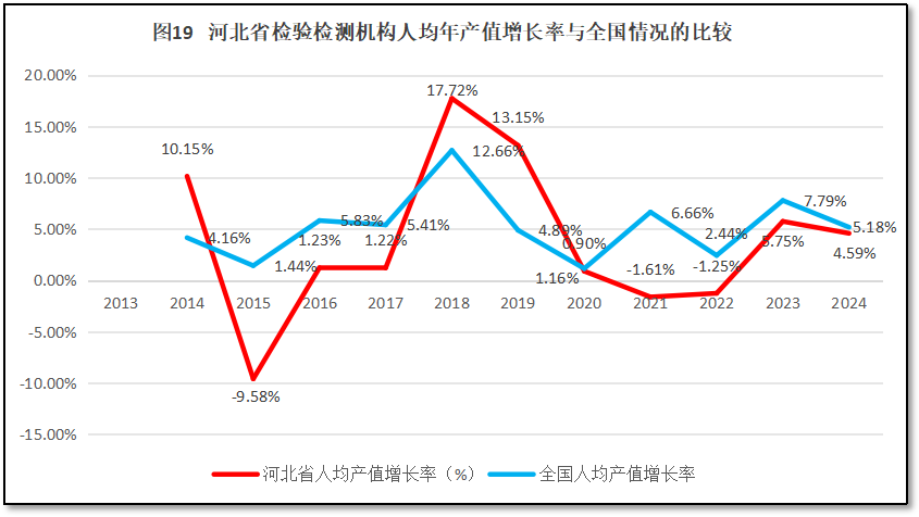再来看河北省检验检测机构人均年产值增长率与全国人均年产值增长率的比较,如图19所示。