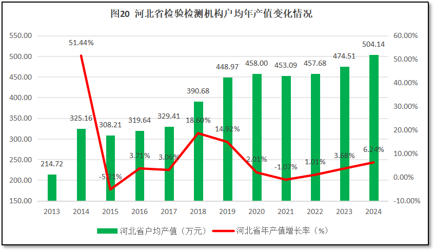 由图20可见,在2020年之前,河北省检验检测机构户均营业收入总体保持增长,但2014-2017年期间以及2019-2022年期间有两个较为明显的平台期,没有增长或者增长极少。2024年河北省检验检测机构户均年产值达到504.14万元,是2013年的2.34倍,连续两年出现了较大增长。从增长率的曲线来看,除了头两年数据误差大显得增长率很高之外,从2015年起,河北省检验检测机构户均年产值增长率总体稳定,在2018年前后有一个较为显著的增长高峰,此后增速回落。2021年之后,增长率曲线又有缓慢回升,2024年度同比增幅为6.24%。