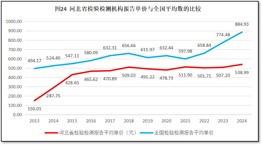 由图24可见,河北省检验检测报告的单价除了在2013-2015年期间有较为明显的增长外,从2015年起到2024年末虽总体保持增长,但增长十分缓慢,且一直比全国平均水平要低,最近几年还有被全国平均水平拉开距离的趋势。2024年河北省检验检测机构报告单价538.99元,排名全国第30位,与全国平均数884.93元低了345.94元。可见,河北省检验检测机构不仅对外出具的检验检测报告数量少,其报告单价也低,说明其利润空间小,充分说明了河北省检验检测机构经营发展状况的困难。