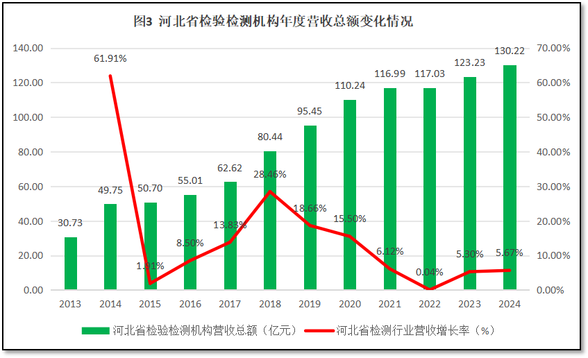 由图3可见,12年来,河北省检验检测机构营收总额总体保持增长,2024年末河北省检验检测行业年度营收总额达到130.22亿元,是2013年的4.24倍。从增长率曲线来看,除了头两年因统计数据质量不高导致曲线波动巨大之外,2018年之前,河北省检验检测就营收总额持续增长,并且到2018年达到28.46%的增长高峰。但至此之后逐年下降,并在2022年降到0.04%的极低增幅。最近两年增幅有所反弹,2024年度增长率达到5.67%。