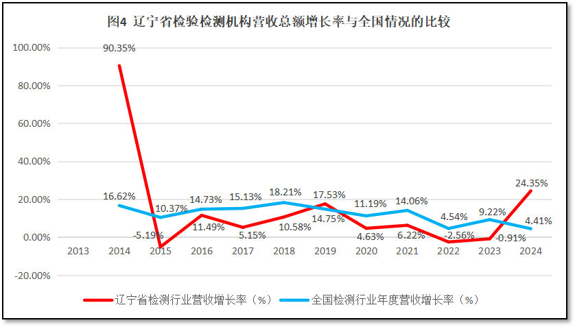 比较辽宁省检验检测行业年度营收总额增长率与全国检验检测行业年度营收总额增长率随时间的变化,如图4所示。