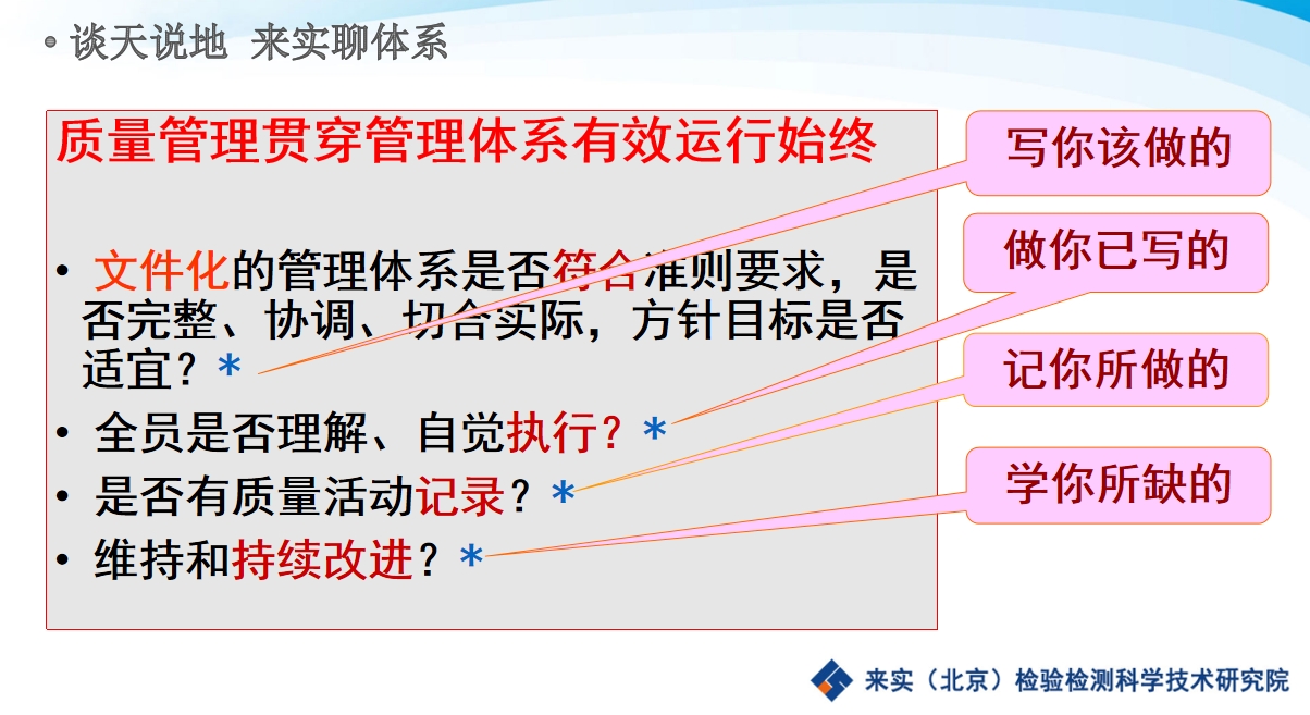 本次星空电竞聊体系的主要内容,徐老师主要谈谈实验室管理体系如何能够有效运行,指出了十六字方针,供大家参考学习。